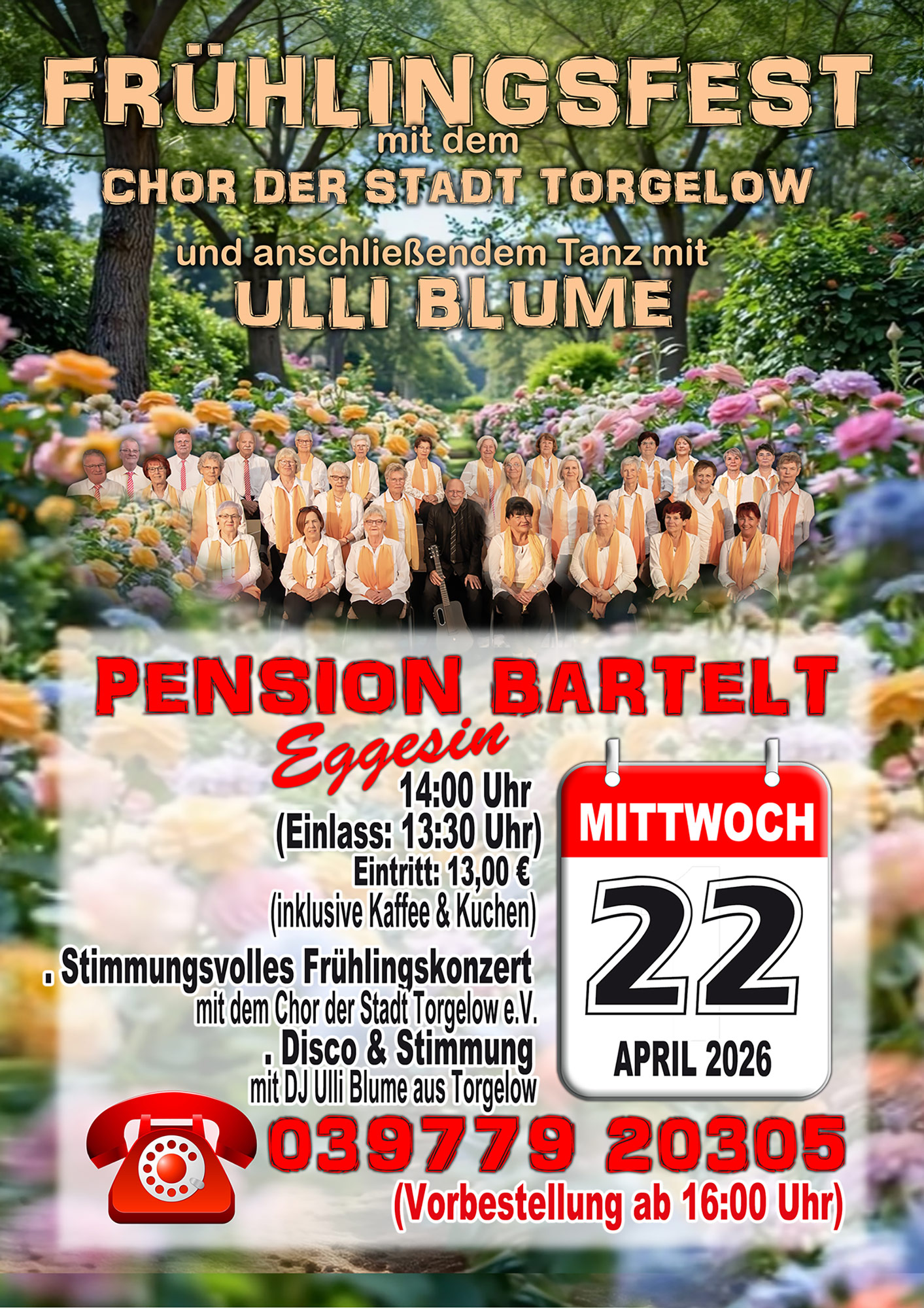 mit dem Torgelower Stadtchor und DJ Uli Blume | Pension Bartelt Heidestr. 3 | Einlass: 13.30 Uhr | Beginn: 14.00 Uhr